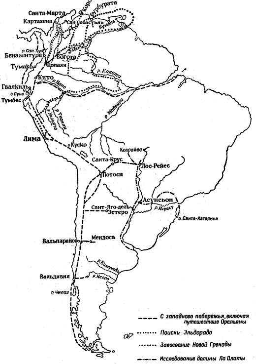 Однако же само Перу страдало от междоусобиц среди испанцев, и отчасти именно с целью избавиться от беспокойных элементов солдатни вице-король маркиз де-Каньете послал Педро Урсуа в экспедицию в долину реки Амазонки. Конечно, им руководили и другие соображения: в те времена как в городе Лима, так и по всем провинциям Перу ходили слухи (распространяемые индейцами Бразилии) о существовании каких-то богатых областей, будто бы виденных ими на пути от бразильского побережья. В этих областях жил «золотой человек» (эль-дорадо). Вот каким образом испанские искатели приключений в Перу втянулись в те же поиски Эльдорадо (мифической золотой страны), которыми испанцы в северо-западной части Южной Америки занимались вот уже тридцать лет.