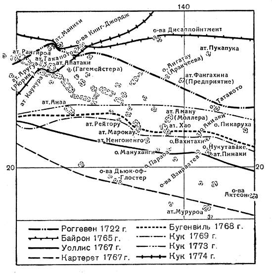 Маршруты мореплавателей XVIII в. в архипелаге Туамоту