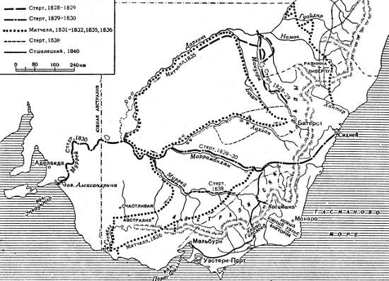 Однако к исходу 50-х годов значительная часть Австралии все еще оставалась неисследованной, а ее внутренняя область обозначалась сплошным «белым пятном», которое только на юго-востоке пресекалось извилистой линией — трассой похода Стерта.