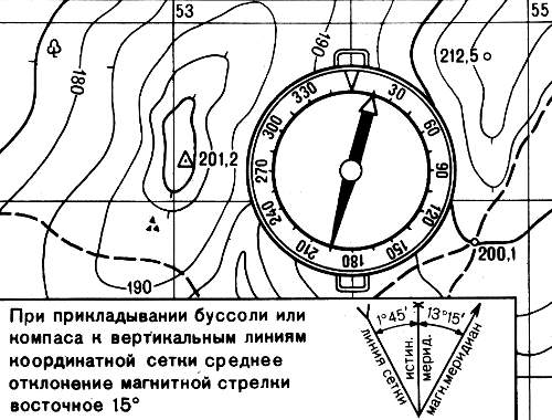 Рис. 48. Ориентирование карты с помощью компаса по линии координатной сетки (с учетом магнитного склонения) δ = +13°15' и сближения меридианов γ = —1°45'. Поправка направления П = δ — γ = +13°15' — (—1°45') = +15°