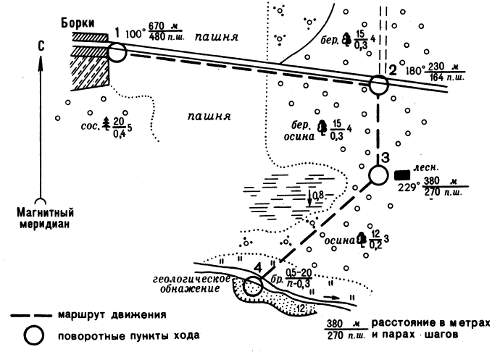 Предварительно по карте намечают и изучают линию маршрута, выбирают ориентиры в точках поворота, измеряют расстояния и углы направления прямолинейных отрезков хода. Повороты намечают вблизи объектов, находящихся около линейных ориентиров, перпендикулярных пути следования (пересечение дорог, линии связи и электропередач, постройки и другие сооружения у берегов рек и водоемов). Это облегчает точный выход к точкам поворота при плохой видимости. Расстояния, измеренные по карте, пересчитывают в число пар шагов того человека, которому предстоит идти по азимуту. Дирекционные углы отрезков маршрута, взятые с карты, переводят в магнитные азимуты по формуле AM = α + γ + δ, где α — дирекционный угол, γ — сближение меридианов, δ — магнитное склонение, значения которых приведены на нижнем поле листа карты. Если их алгебраическая сумма (γ + δ) меньше 1°, ею можно пренебречь.