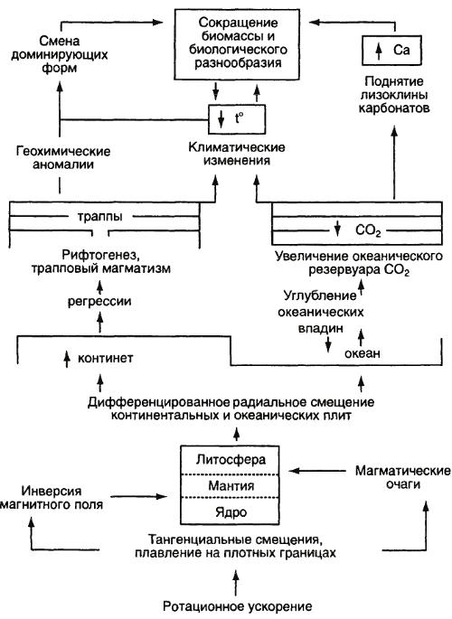 Движущей силой изменения и эволюции биосферы выступает ее взаимодействие с геологическими оболочками Земли, периодически принимающее характер кризиса. Конечно, эволюционные преобразования в биосфере совершаются и в спокойные межкризисные периоды, но их масштабы неизмеримо скромнее. Для быстрых и радикальных перемен необходим толчок извне. Когда он возникает и оказывается воспринятым биосферой, импульсы от нее по нисходящей каузальной цепочке идут к подчиненным ей системам – биоценозам, популяциям, генофондам. Наиболее вероятен следующий порядок развертывания геологических событий (рис. 29).