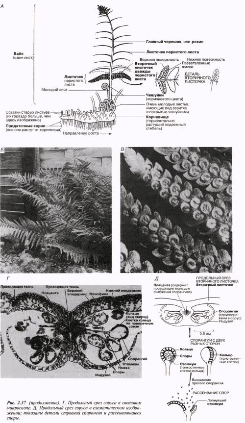 Рис. 2.37. Внешний вид и основные признаки спорофитного поколения мужского папоротника Dryopteris filixmas. А. Схема и детали строения одной пары листочков; все другие листочки имеют такое же строение. Б. Листья (вайи) папоротника. В. Нижняя поверхность листа с видимыми на ней сорусами (некоторые сорусы покрыты индузием). Г. Продольный срез соруса в световом микроскопе. Д. Продольный срез соруса в схематическом изображении; показаны детали строенияспорангия и рассеивающиеся споры.