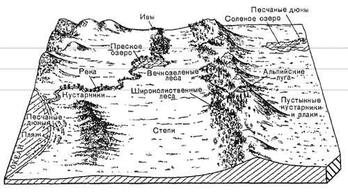 Еще дальше в глубине континента находятся горы; их склоны в нижней части покрыты травянистой растительностью, а выше - широколиственными лесами, переходящими еще выше в вечнозеленые леса, и вблизи вершин - альпийские луга с различными злаками и травами. В лесах мы можем встретить оленя, лису, горного льва (пуму), а выше - сурков и кроликов. Горы способствуют выпадению осадков, но по отношению к территориям, расположенным с подветренной стороны от них, они играют роль барьера; поэтому за горами находится пустыня с разреженной растительностью, состоящей из кустарников и кустистых злаков. Среди ее обитателей могут быть антилопы, американские жесткошерстные кролики и другие грызуны, койоты, ящерицы, змеи и скорпионы. В соленых озерах пустыни можно найти беспозвоночных и некоторых мелких рыб, приспособившихся к жизни в соленой воде, а по берегам - водяных птиц. Все эти разнообразные растения и животные приспособились к среде, в которой они обитают.