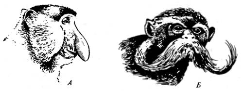 Рис. 10.9. Пример полового диморфизма в строении приматов: А — голова самца носача (Nasalis larvatus); Б — голова самца тамарина (Saguinus mystax). Усы и нос в значительно меньшей степени развиты у самок этих видов (из А. Портмана, 1967, А.А. Парамонова, 1978)