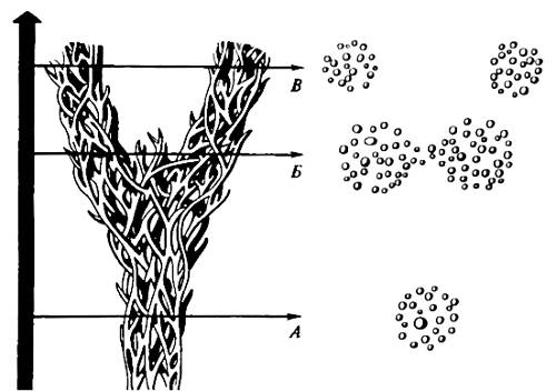 Рис. 13.1. Схема видообразования. Каждая отдельная веточка — популяция А — уровень исходного единого вида; Б — момент незавершенного разделения видов; В — два новых вида (по Ф.Г. Добржанскому, 1957). Выделены ареалы отдельных подвидов. Крайние звенья цепи в районе северо-западной Европы (двойная штриховка) обитают совместно и не скрещиваются в природе. Стрелки — направления вероятного расселения вида из Берингийского центра происхождения. Иногда подвидам, показанным на схеме, придается видовой статус