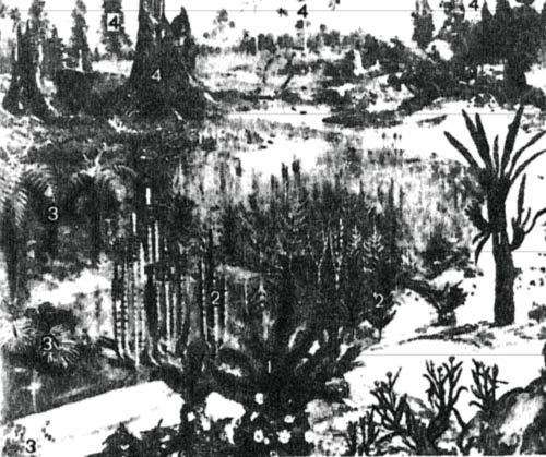 Фото 28. Реконструкция общего вида растительности, типичной для мезозойской эры (только голосеменные и бессеменные растения), 1. Растения, родственные цикадовым. 2. Растения, родственные хвощам. 3. Папоротники. 4. Хвойные. Другие мезозойские ландшафты показаны также на фото 40, 43, 44, 45, 47.