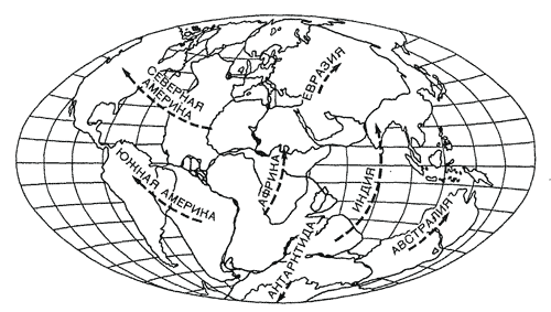 Рис. 27. Карта, иллюстрирующая пока еще не доказанное положение о том, что около 200 миллионов лет назад (в начале юрского периода) на Земле существовал; огромный единый континентальный массив, который затем распался на плиты. Последние перемещались в направлениях, указанных стрелками, и создали существующие ныне континенты. Подбор соответствующих друг другу фрагментов проводился с помощью ЭВМ.
