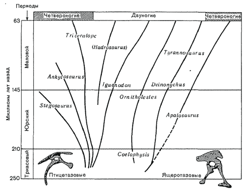Мы уже говорили о том, что динозавров существовало несколько сот видов. Но все они принадлежали к двум четко выраженным подразделениям, которые произошли от одного общего предка в триасовое время, прежде чем появились динозавры как таковые. Название «динозавр» является скорее популярным, чем научным. Оно означает «страшный ящер», и когда его впервые ввели, оно относилось к очень крупным и свирепым животным. Но динозавров такого типа было относительно немного среди тех многочисленных рептилий, которых мы в настоящее время относим к динозаврам. В эту группу входит большое число рептилий, не обладавших ни свирепостью, ни большими размерами.