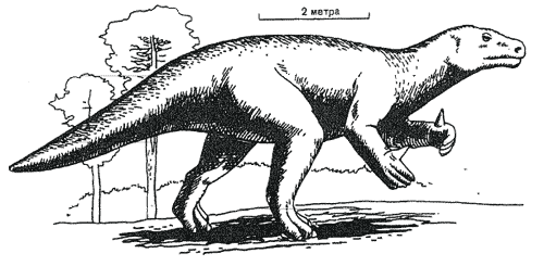 Рис. 48. Игуанодон, крупный двуногий травоядный динозавр, обитавший в Европе.