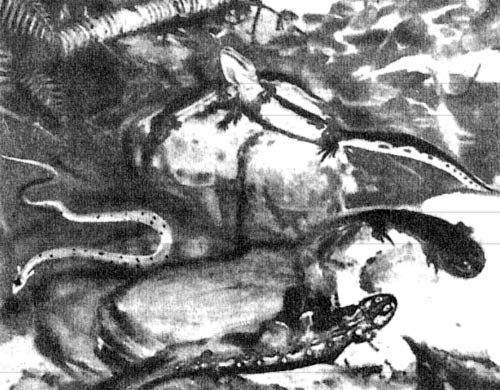 В мезозойских слоях встречается большое количество ископаемых рептилий, приспособленных для жизни в воде. Этот факт может означать только то, что некоторые рептилии вернулись обратно в море, на родину, где когда-то давно появились предки динозавров - рыбы. Этот факт требует некоторого объяснения, поскольку на первый взгляд здесь происходил регресс. Но мы не можем считать возвращение рептилий в море шагом назад с эволюционной точки зрения только на том основании, что девонские рыбы вышли из моря на сушу и развились в рептилий, пройдя стадию амфибий. Напротив, это положение иллюстрирует принцип, согласно которому каждая активно развивающаяся группа организмов стремится занять все разновидности среды, в которых она может существовать. В действительности перемещение рептилий в море не слишком отличается от заселения амфибиями рек и озер в позднекаменноугольное время (фото 38). В воде имелась пища и конкуренция была не слишком жестокой, поэтому сначала амфибии, а затем рептилии переселились в воду. Уже перед концом палеозоя некоторые рептилии стали водными обитателями и начали приспосабливаться к новому образу жизни. Эта адаптация шла в основном по пути усовершенствования способа передвижения в водной среде, конечно, рептилии продолжали дышать воздухом так же, как дышит воздухом современный кит, млекопитающее, хотя и сходное по форме тела с рыбой. Более того, мезозойские морские рептилии развились не из какой-либо одной наземной рептилии, которая приняла решение уйти обратно в воду. Ископаемые скелеты неоспоримо свидетельствуют о том, что они имели различных предков и появились в различное время. Тем самым ископаемые остатки показывают, насколько разнообразным был отклик организмов на изменение условий среды, в результате которого создалось обширное пространство, изобилующее пищей и пригодное для заселения.
