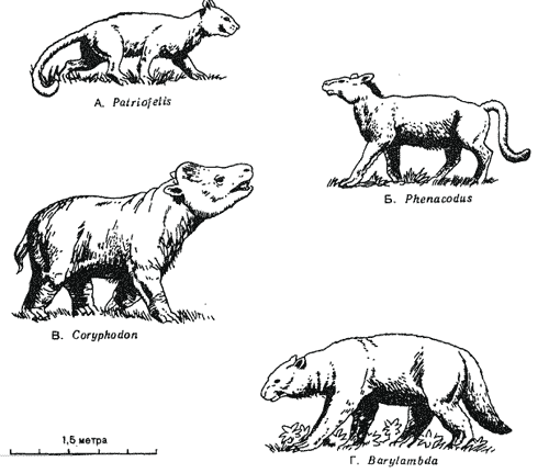 Рис. 55. Четыре представителя ранних и примитивных кайнозойских млекопитающих. A. Patriofelis, хищник. Б. Phenacodus, небольшое травоядное. Один из его родственников, возможно, был родоначальником линии лошадей. В. Coryphodon, травоядное массивного сложения, возможно, обитавшее в болотах. Г. Barylambda, травоядное длиной около 2,5 м.