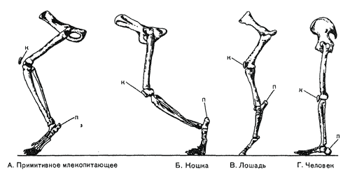 Конечности и зубы травоядных млекопитающих также претерпевали изменения, хотя совсем иначе. Так как пасущиеся животные должны были бегать, у них значительно увеличилась длина и бедра и стопы; мускулы стали более сильными. Пятка приподнялась так высоко, что стопа стала почти вертикально (рис. 56, В), а когти на пальцах стали длиннее и толще. Параллельно с этим произошло удлинение отдельных пальцев, так что другие перестали прикасаться к земле, постепенно уменьшились и в конце концов совсем исчезли (рис. 57). Такое изменение уменьшило вес стопы и способствовало увеличению скорости бега у травоядных млекопитающих и дальности их перемещения. Эта эволюция, происходящая более или менее одновременно у различных видов млекопитающих, может служить свидетельством определяющего влияния среды. Однако вследствие дифференциации среды изменение стопы зашло у отдельных видов млекопитающих дальше, чем у других. У свиней «действуют» четыре пальца, у носорогов - три, у верблюдов, оленей и крупного рогатого скота - два, у лошадей - один.