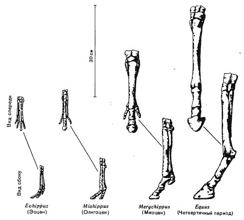 Рис. 57. Кости передних конечностей четырех родов ископаемых лошадей. Через 50 миллионов лет эволюционного развития число пальцев уменьшилось от четырех до одного, а общая длина конечности увеличилась почти в 12 раз.
