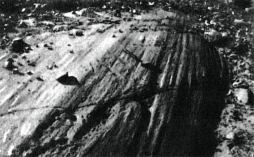 Обломки породы различного размера, подхваченные движущимся льдом, вмерзают в нижнюю поверхность льда и, как частицы песка на наждачной бумаге, скребут и царапают скальную поверхность, оставляя на ложе ледника множество прерывистых борозд и царапин (фото 51), которые совершенно не похожи на следы, оставленные водными потоками. Местами целые глыбы породы отделяются по трещинам от коренного ложа и уносятся ледником, увеличивая собой количество обломков, вмерзших в подошву ледника.