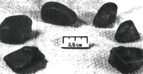 Фото 53. Шесть галек, произвольно выбранных из ледниковых отложений на территории штата Нью-Йорк. У каждой гальки есть одна или несколько плоских граней, оглаженных ледником.