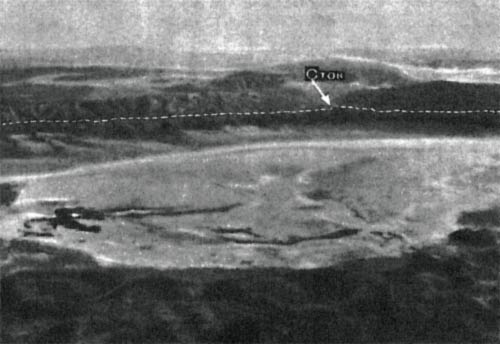 Фото 54. Котловина сухого озера Серлс, Калифорния. Вид с самолета на юго-восток, на белую засоленную плоскую поверхность, представляющую собой дно высохшего озера. Пунктиром показано наивысшее положение береговой линии древнего озера Серлс, почти на 200 м выше современного днища. Когда уровень озера был на этой отметке, вода переливалась па протоке, теперь высохшей, в другую впадину (левая задняя часть снимка), где образовалось другое, еще более глубокое озеро.