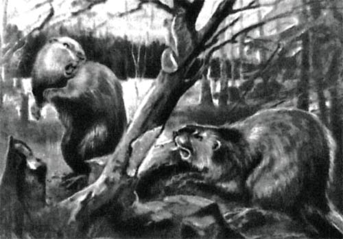 Фото 57. Два гигантских бобра, достигавших трех метров в длину и, вероятно, весивших около 225 кг, почти столько же, сколько современный черный медведь. Для сравнения в центре рисунка изображена белка. Реконструкция.