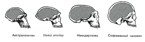 Рис. 74. Эволюция человеческого черепа за пять миллионов лет. Череп стал больше и более округлым, лицо короче и ближе к вертикальному положению, а надбровные дуги менее выпуклыми. Объем мозга показан штриховкой (масштаб не выдержан).