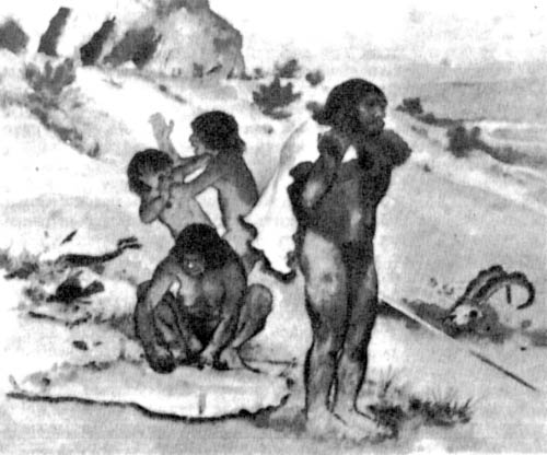 Фото 68. Неандертальская семья, около 100 000-50 000 лет назад. Короткая накидка, возможно, означает, что человек стал носить одежду, так как волосяной покров на его теле постепенно исчезал. Меховая одежда, хотя и простая, должна была подходить к условиям ледникового времени. Реконструкция.