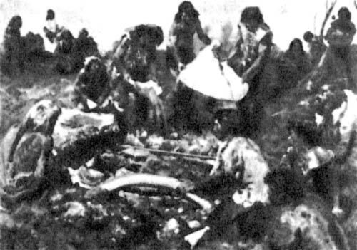 Фото 69. Члены группы кроманьонцев на церемонии погребения одного из них, вероятно убитого на охоте. Тело завернуто в шкуры и украшено ниткой бус из раковин; вместе с ним кладут орудия и бивень мамонта. Перед тем как засыпать могилу, тело посыпают красной охрой (лимонит или гематит). Время действия около 30 000 лет назад. Реконструкция.