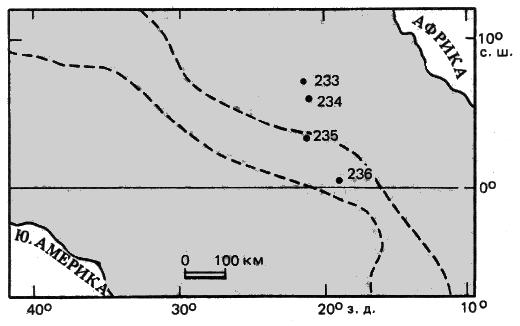 5. И наконец, самое важное «доказательство». Р. Кольбе (1957), обрабатывая образцы, собранные шведским океанографическим судном в экваториальной Атлантике, к своему большому удивлению, нашел в осадках остатки пресноводных диатомовых водорослей в Местах, обозначенных на рис. 14 точками. Не смесь пресноводных и морских водорослей, а исключительно пресноводных. При этом слой, из которого Кольбе взял образцы для анализа, относился к плейстоцену. Таким образом, эти осадки образовались от миллиона до нескольких сотен тысяч лет назад. На первый взгляд кажется совершенно очевидным, что они могли образоваться только в пресноводной среде, в каком-нибудь озере, которое тогда располагалось на выступающей части хребта.