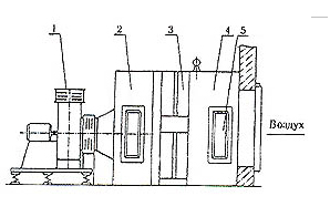 соединительная секция 2 с вентиляторной установкой 1, оросительная и калориферная секции 3, секция фильтра, приёмная секция 4 и воздушный утеплённый клапан 5.
