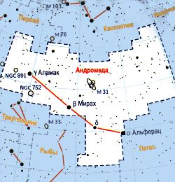 Андромеда — созвездие северного полушария, имеющее характерный рисунок, называемый астеризмом. Это три самых ярких звезды, расположенные в линию, протянувшуюся с северо-востока на юго-запад.