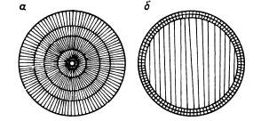 Поперечные разрезы природного (а) и культивированного (б) жемчуга. В культивированном жемчуге имеется лишь тонкий внешний перламутровый слой с характерным радиально-игольчатым развитием кристаллов арагонита, тогда как такая внутренняя структура обнаруживается во всей природной жемчужине. Структура перламутрового шарика, использованного в качестве затравки, субпараллельно-слоистая