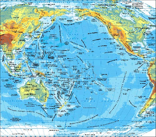 Рельеф дна. Значительная часть лежит на одной литосферной плите. По границам – сейсмические пояса. Шельф невелик, по окраинам – 25 из 35 глубоководных желобов. На юго-востоке – Восточно-Тихоокеанское поднятие, из системы срединно-океанических хребтов.