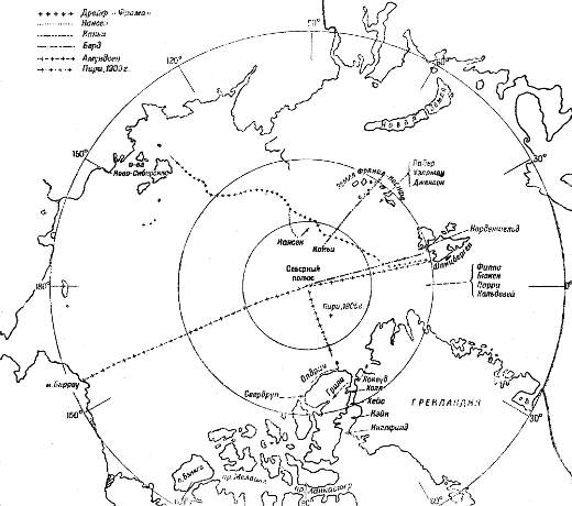 Земля Франца Иосифа , куда Нансен прибыл пешком, служила исходной базой для целого ряда попыток достичь полюса. Экспедиции Пайера (1874 г.), Уэлмена (1894 г.) и Джексона (1894 г.) были все более или менее прямо связаны с открытиями на самом архипелаге или вблизи него, и ни одной из них не удалось зайти особенно далеко на север. Крайним рубежом был достигнутый Пайером мыс Флигели (81°5Г с.ш.). Более успешной оказалась экспедиция герцога Абруццкого (1901 г.). Один из ее участников, капитан У. Каньи, вышел с Земли Франца Иосифа 11 марта и 25 апреля достиг 86 34' с.ш., побив, таким образом, рекорд Нансена. Достижение Каньи тем более замечательно, что ему приходилось бороться с тяжелыми препятствиями и лишениями. Рекорд Каньи продержался до 1906 г., но поскольку он был побит Пири в другом (западном) полушарии, результаты, достигнутые Каньи и Пири, трудно сравнивать между собой.