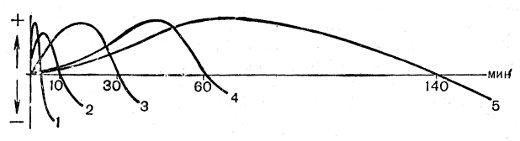 Хорошо известны двух- и трехфазные, реже многофазные изменения возбудимости мышечных и нервных волокон при действии самых разнообразных раздражителей. На рисунке 5 представлены данные об изменении возбудимости нерва лягушки при действии некоторых химических агентов, а также гипертонии и гипотонии. Направление вверх означает повышение, а вниз — снижение возбудимости. При действии соляной кислоты (кривая 1) фаза повышенной возбудимости протекает сравнительно быстро (около 3 мин) и резко сменяется фазой сниженной возбудимости. Гораздо длительнее, в течение 140 мин, повышенная возбудимость сохраняется при действии хлорида бария (кривая 5). Бегущая волна возбудимости также сопровождается волнообразными изменениями возбудимости нерва (рис. 6). Рефрактерная фаза (сниженная возбудимость) сменяется повышением возбудимости (супернормальная фаза), а затем следует незначительное снижение (субнормальная фаза). Все эти изменения совершаются очень быстро, в течение 93 мс.