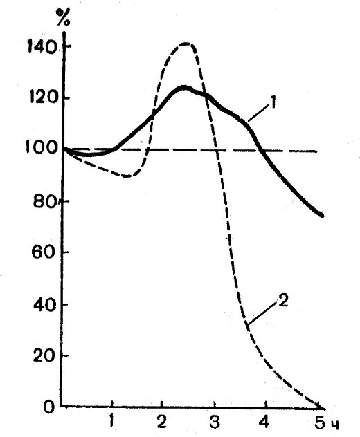 Фазное течение процесса проявляется в том, что направление изменений различных параметров меняет свой знак, несмотря на однозначно идущее нарастание внешнего воздействия. Ниже приведены некоторые экспериментальные данные, иллюстрирующие такой волнообразный характер изменения ряда параметров в ходе развития клеточной реакции.
