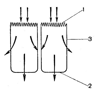 Рис. 18. Потоки сахара в эпителиальных клетках кишечника через мембраны: 1 — апикальную; 2 — базальную; 3 — латеральную.