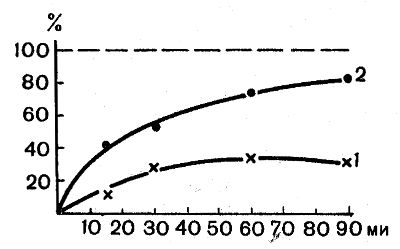 Рис. 19. Влияние инсулина на поступление D-ксилозы в мышечные подокна крысы (Corlin a Hechter, 1961): 1 — без инсулина; 2 — с инсулином. По оси абсцисс — время от начала помещения мышцы в раствор сахара, в минутах; по оси ординат — содержание сахара в мышце, и % от его количества в среде (0,4%), принятого за 100%