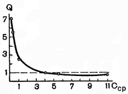 Рис. 23. Зависимость коэффициента Q от концентрации лактозы в окружающей равновесной жидкости (Сср, %) при распределении лактозы между дрожжами и окружающей средой