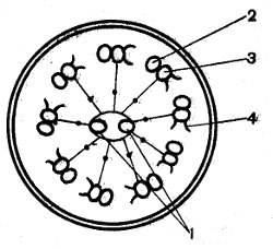 Рис. 44. Схема поперечного сечения реснички (жгутика): 1 — центральные фибриллы; 2 — субфибрилла В; 3 — субфибрилла А; 4 — ручки