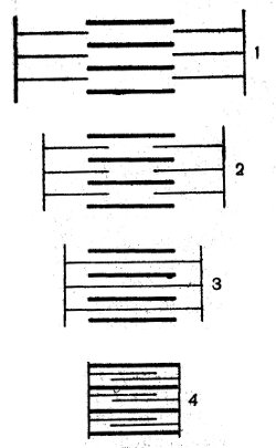 Рис. 47. Расположение толстых и тонких протофибрилл при разной длине саркомера (Huxley, Hanson, 1960): 1 — при растяжении; 2 — в состоянии покоя; 3 и 4 — при сокращении
