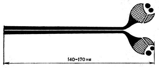 Толстые протофибриллы (толщиной 10 нм, длиной 1,5 мкм) построены из фибриллярного белка миозина, молекулы которого асимметричны и представляют собой двухцепочную структуру, заканчивающуюся двумя глобулярными головками (рис. 48). Длина молекулы достигает 180 нм, а толщина — 2,5 нм. Молекулы миозина располагаются в толстых нитях таким образом, что головки сосредоточены к периферии анизотропного диска, они-то и образуют так называемые поперечные мостики. Каждая миозиновая нить имеет 210 — 230 таких мостиков. В середине анизотропного диска в районе Н-зоны участки миозиновых волокон гладкие, без мостиков; в этом участке миозиновые нити утолщаются до 14 нм. Проходящая через середину миозиновых нитей мембрана М представляет сетевидную структуру, связывающую между собой толстые протофибриллы. Мостики (головки) имеют очень сложное строение, состоят они из нескольких субфрагментов и обладают ферментативной АТФ-азной активностью и способностью связывать актин.