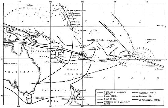 По следам Кука в Тихий океан ринулось множество мореплавателей, и за последнюю четверть XVIII в. и первые годы XIX в. в водах Океании и Австралии побывало больше кораблей, чем за предыдущие два с половиной столетия.