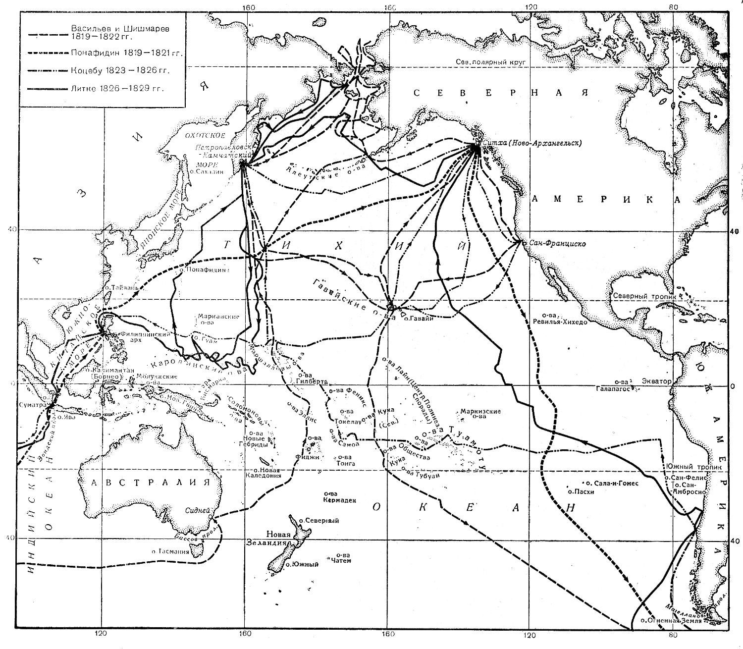 Маршруты Васильева и Шишмарева, Понафидина, Коцебу и Литке Из «Атласа истории географических открытий и исследований». 1959 г.. Увеличить (в отдельном окне)