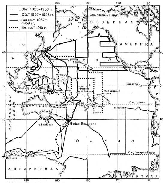 Маршруты плаваний советских океанологических судов «Витязь» и «Обь». Из «Атласа истории географических открытий и исследований». 1959 г. Маршрут «Витязя» 1961 г. нанесен по материалам Отдела морских экспедиционных работ АН СССР