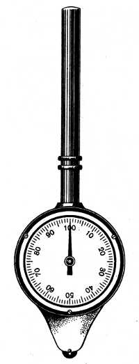 Циферблат имеет 10 делений, каждое из которых соответствует одному обороту колесика; на барабане колесика имеется 100 делений для учета части окружности при неполном обороте колесика. По верньеру 9 можно учесть движение колесика с точностью до 1/10 доли наименьшего деления барабана, т.е. до — 1/1000 части его окружности1. Полный отсчет состоит из четырех цифр, которые получают в таком порядке: первую — по циферблату (число оборотов колесика), вторую и третью — по барабану колесика, четвертую — по верньеру. Пример записи отсчета — 3412.