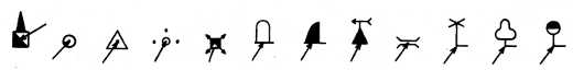 Внемасштабными (или точечными) условными знаками показывают на картах объекты, занимающие на местности очень небольшую площадь, не выражающуюся в масштабе карты, положение которых фиксируется на карте точкой (колодец, отдельное дерево, указатель дорог и т. п.). Рисунок знака имеет или правильную геометрическую форму (кружок, треугольник, звездочка и т. п.), или схематически, упрощенно воспроизводит внешний вид объекта. Истинное положение объекта на местности определяется одной из точек знака, которая находится: в центре знаков геометрической формы; в середине основания у фигур неправильной формы; в вершине прямого угла у основания знаков с «подсечкой» (горизонтальной черточкой); в центре нижней фигуры у знаков, представляющих собой сочетание нескольких фигур (рис. 29).