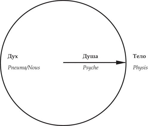 Что значит познать себя? Кто мы такие? В понимании гностиков человек - это три составляющих: тело, душа и дух.(4) Слова «душа» и «дух» так привычны, что мы полагаем, будто нам известно их значение, но так ли это? Что именно представляет собой «душа»? Чем она отличается от «духа»? И хотя сегодня эти понятия настолько расплывчаты, что практически утратили смысл, для гностиков они обладали вполне ясным и определенным значением. Поясняя свое учение, они рисовали круг.