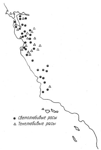 Рис. 2.5. Распространение двух экологических рас Илии Gilia achilleifolia на западе США (по В. Гранту, 1984)
