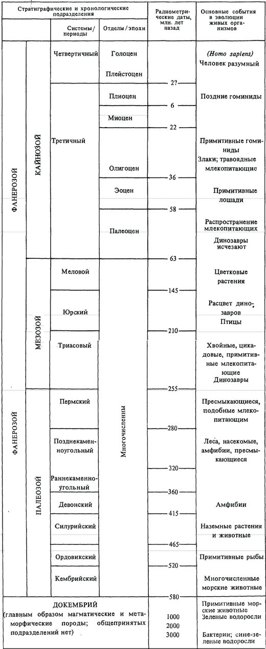 Как показывает таблица 1, систематические датировки слоев заканчиваются на уровне 580 миллионов лет, вблизи основания кембрийской системы. Нижележащие докембрийские породы включают лишь небольшое количество осадочных пластов и главным образом состоят из сложного комплекса магматических и метаморфических пород. Многие из этих пород были датированы. Измеренный до настоящего времени возраст наиболее древних пород достигает 3,7 миллиарда лет, но, конечно, будут обнаружены и более древние. Что касается возраста самой Земли, то он не определен точно, но различные данные, в том числе астрономические, позволяют предположить, что Земля как планета насчитывает 4,5 миллиарда лет.