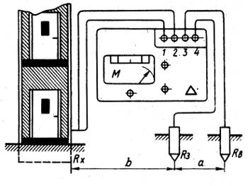 Измеряют сопротивление контактов заземляющего устройства мегомметром типа М-416, который имеет четыре пронумерованных зажима, два из которых соединяют с объектом измерения, а третий и четвертый — с зондом и вспомогательным заземлителем, как показано на рис. 4.3. Зонд и вспомогательный заземлитель представляют собой стальные стержни диаметром не менее 5 мм и длиной 0,8—1,0 м, которые забивают в землю на глубину более 0,5 м. Расстояние между зондом и вспомогательным заземлителем а = 10 м, а между зондом и испытываемым заземлителем b = 20 м. В качестве соединительных проводов применяют медные гибкие изолированные провода сечением 0,5—1,5 мм2 и длиной каждый 20—30 м. Прибор следует размещать как можно ближе к измеряемому объекту.