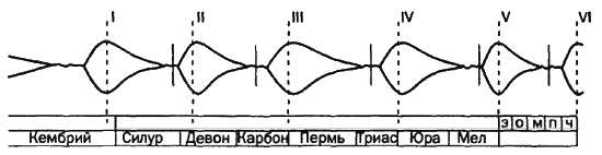 Рис. 8. Схема развития волн жизни по Соболеву (из: Личков, 1965). Революции: I – восточнославянская; II – каледонская; III – варисцийская; IV – древнекиммерийская; V – новокиммерийская; VI – альпийская; э – эоцен; о – олигоцен; м – миоцен; п – плейстоцен; сплошная линия – иссушение; пунктирная – увеличение влажности.