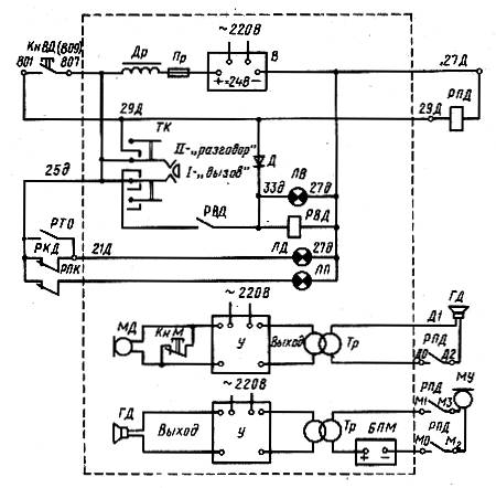 Рис. 5.1. Принципиальная электрическая схема диспетчерской связи (вне пунктирного контура показано оборудование, поставляемое вместе с лифтом)